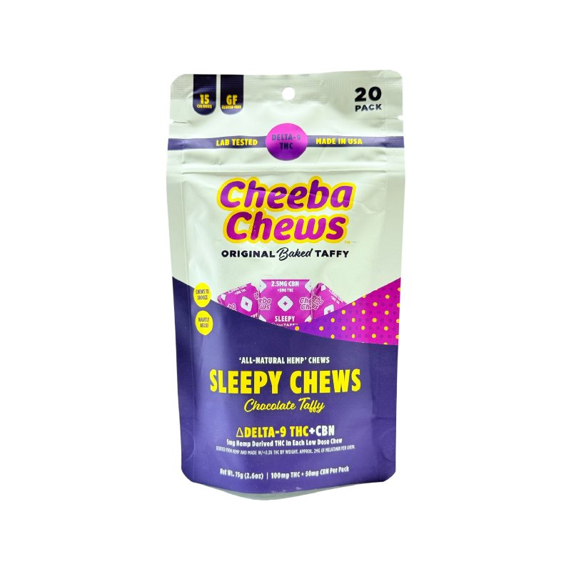 Drift into dreamland with Cheeba Chews Sleepy, the perfect nighttime snack designed to help you snooze. Each chocolate taffy chew is crafted with a 2:1 THC : CBN ratio and enhanced with approximately 2mg of melatonin, creating a gentle, relaxing effect to support a restful night’s sleep.