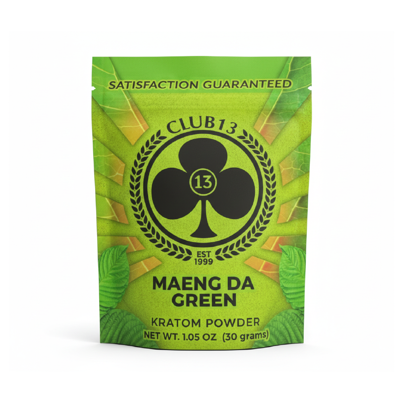 Club 13 Green Maeng Da Kratom Powder is a well-balanced and beginner-friendly Kratom strain, known for its calming yet gently uplifting profile. Green Maeng Da sits perfectly between red and white vein varieties, offering a smooth combination of relaxation, mild energy, and mental clarity without feeling overwhelming.