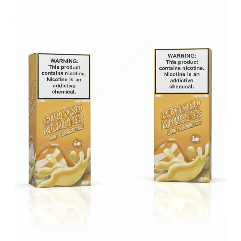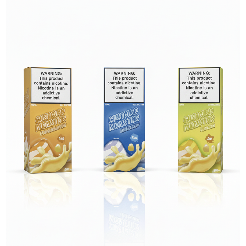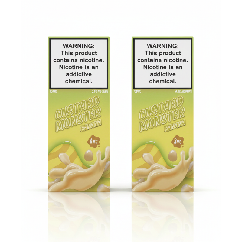 Custard Monster Vape Juice by Monster Vape Labs features a thick, smooth custard base blended with rich dessert flavors. Each flavor is crafted to deliver a creamy, satisfying vape that is full of depth without being overpowering. Available in Banana, Butterscotch, and Blackberry, these premium e-liquids are made in the USA using synthetic freebase nicotine and are designed for excellent flavor and vapor production.