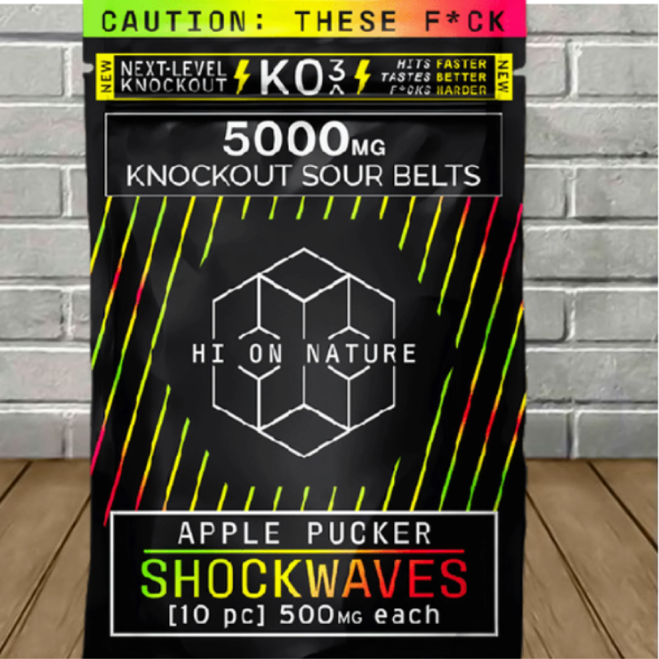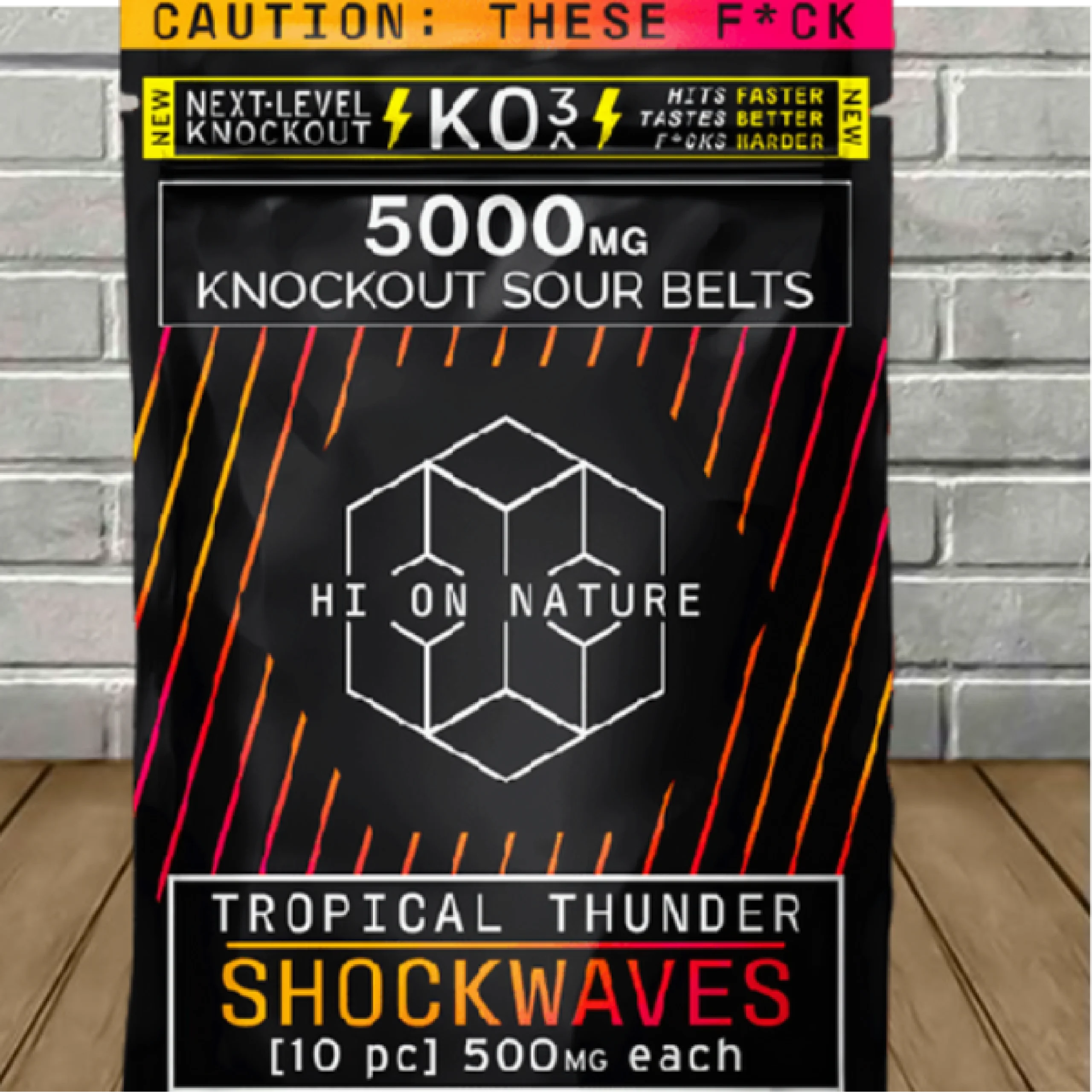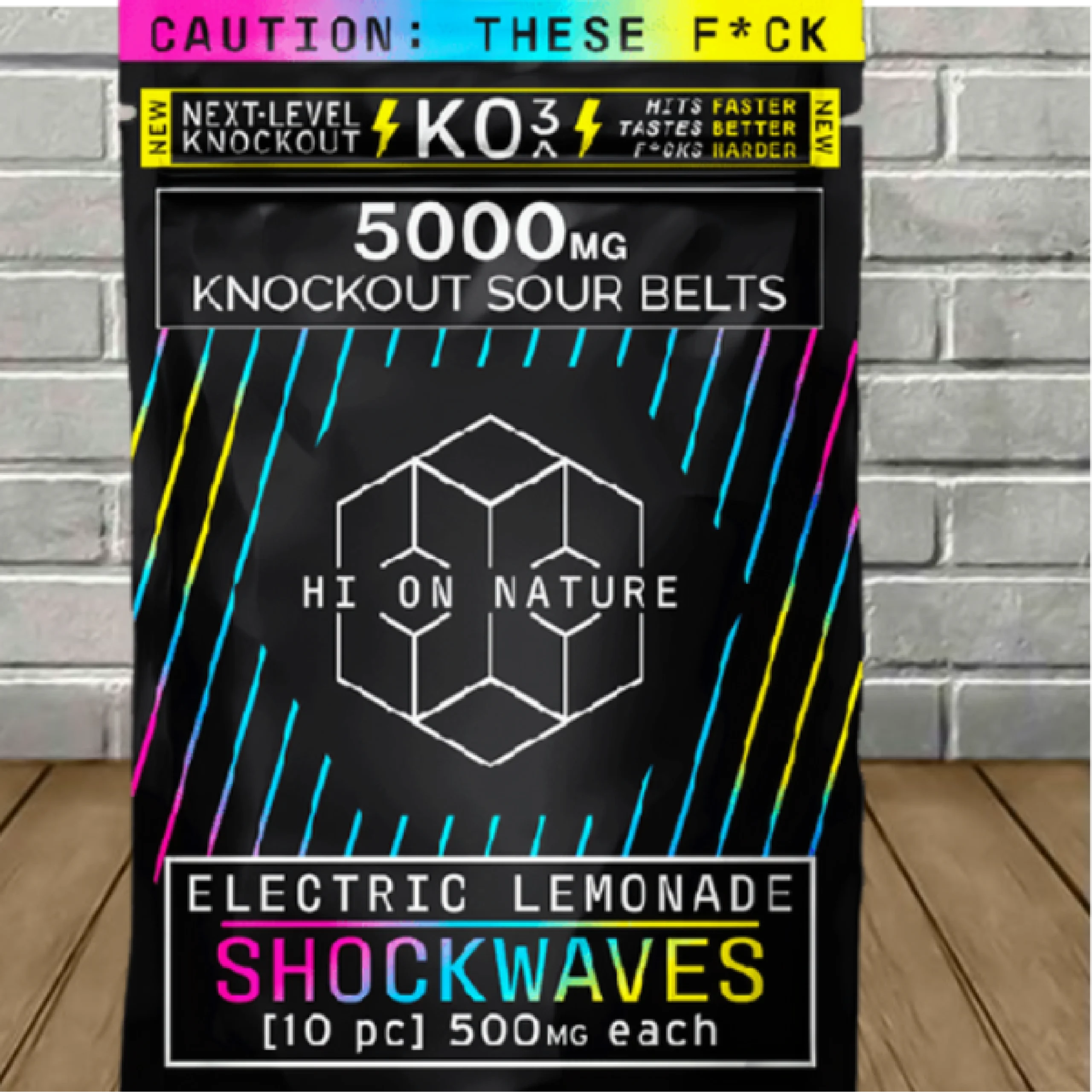 Hi On Nature Next Level KO3 Shockwaves 5000mg deliver a potent and high-quality cannabinoid experience in every sour belt gummy. Each gummy is infused with 500mg of a knockout blend including THCP, HHCO, HHC, and Delta 8 THC, with additional CB+ activators such as CBC and CBDV for fast-acting effects.