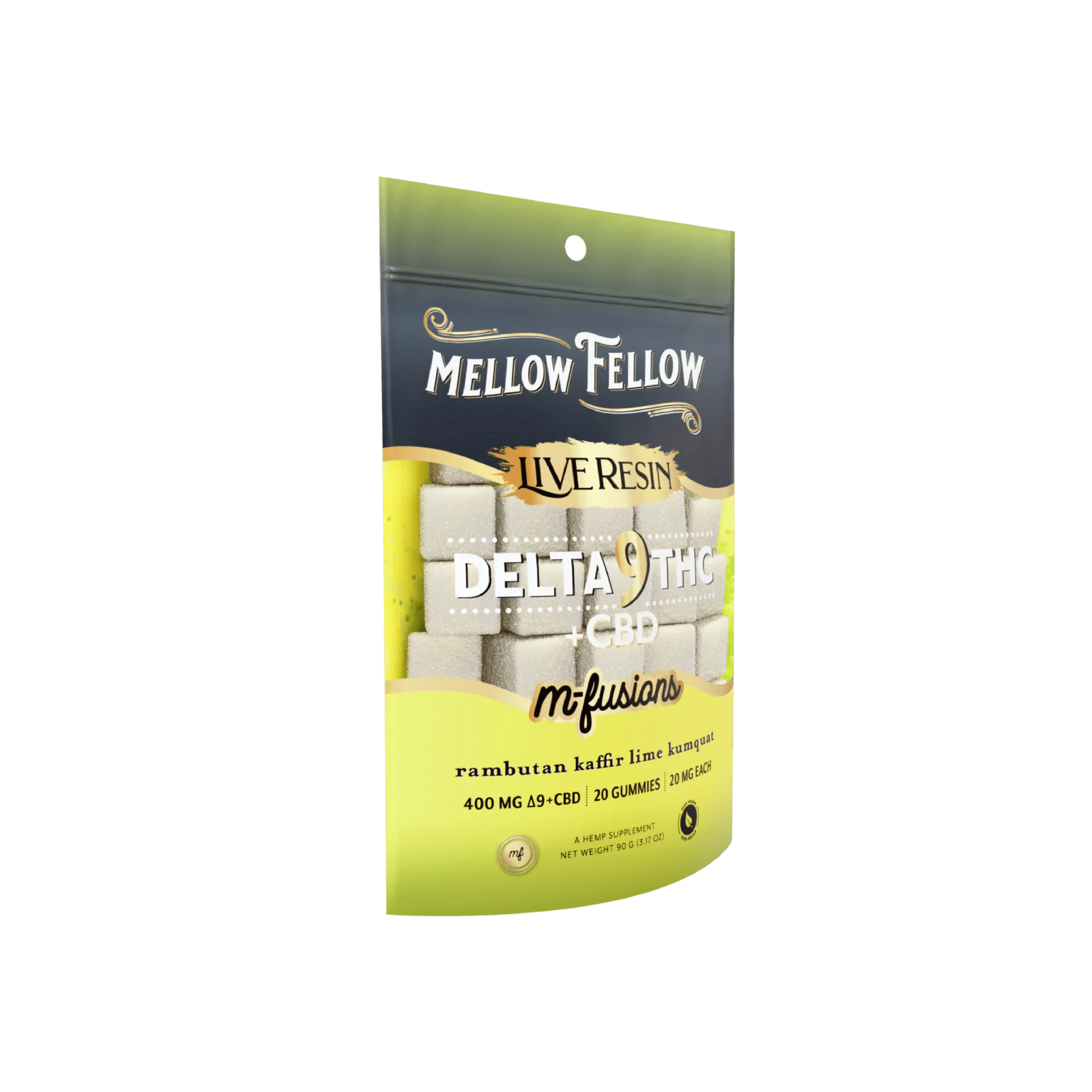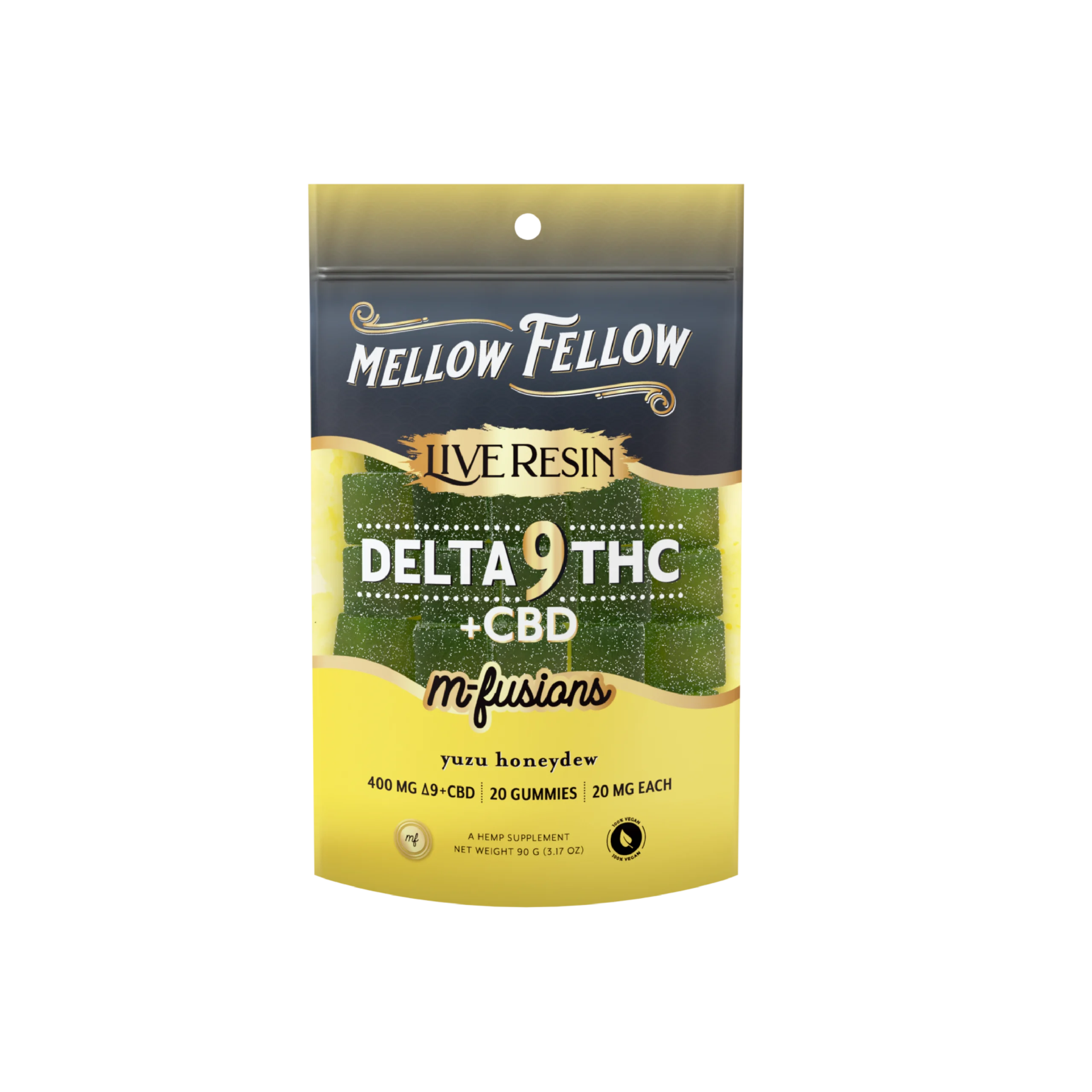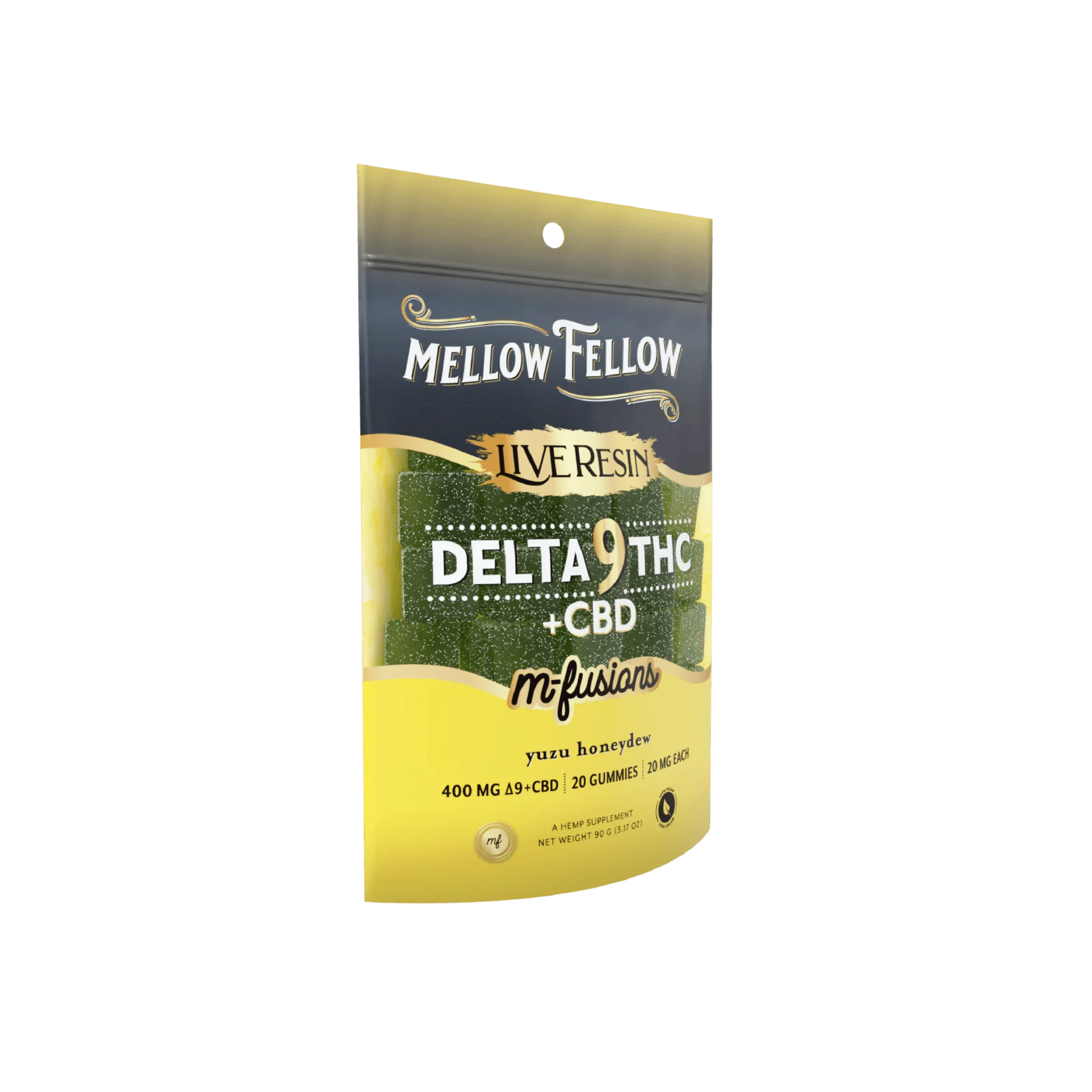 Experience a harmonious blend of citrus and sweetness with Mellow Fellow D9+CBD Live Resin Edibles in Yuzu Honeydew. Each gummy combines the refreshing zest of Yuzu with the natural sweetness of Honeydew melon, delivering a delightful and balanced flavor experience. Infused with a 50/50 ratio of Delta 9 THC and CBD, these live resin edibles provide a perfect balance of relaxation and relief with every bite.