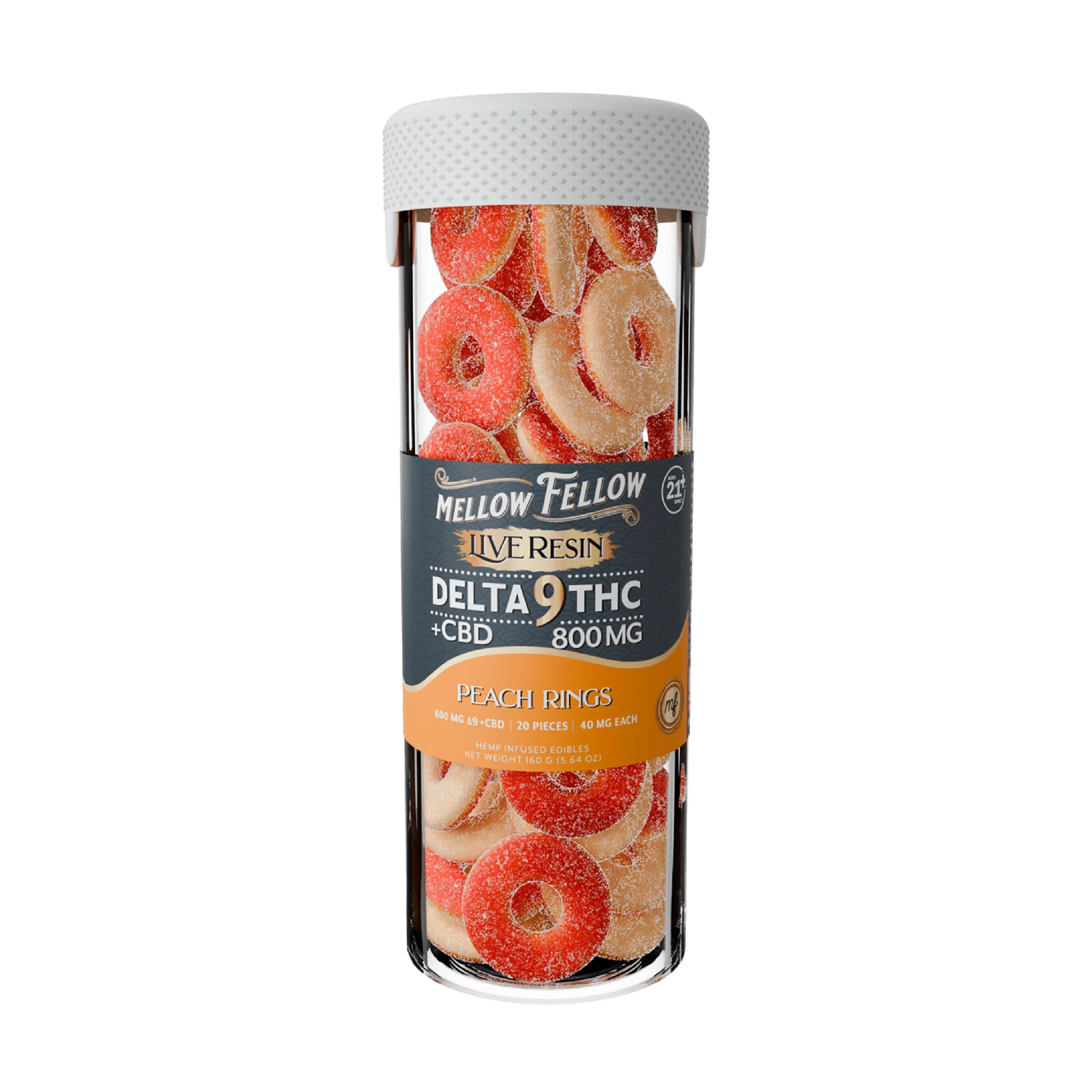 Mellow Fellow Live Resin Peach Rings ek premium hemp-derived edible experience deliver karti hain, jahan bold peach flavor aur powerful effects perfectly balance hote hain. Ye gummies live resin ke sath infused hain, jo enhanced potency aur smoother effects provide karta hai.