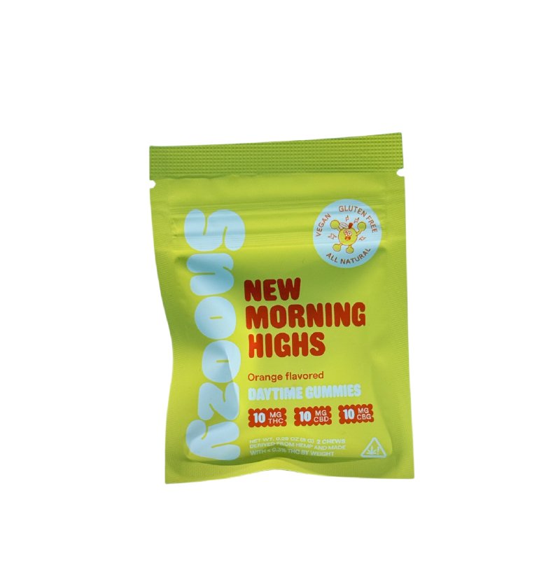 Start your day with a burst of energy and focus using Snoozy New Morning Highs Daytime Gummies. Each gummy is carefully crafted with 10mg THC, 10mg CBD, and 10mg CBG, giving a total of 60mg of hemp-derived cannabinoids per 2-count pack. Infused with natural orange flavor, these vegan gummies provide a refreshing citrus taste with minimal hemp flavor.
