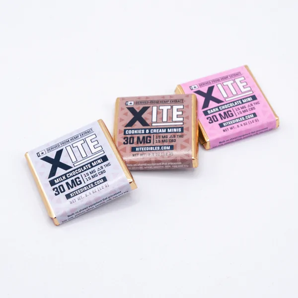 XITE Cookies & Cream Delta 9 THC + CBD Minis combine the classic indulgence of cookies and cream with a perfectly balanced 1:1 ratio of Delta 9 THC and CBD. Each mini delivers 15mg THC + 15mg CBD for a total of 30mg per piece, offering a smooth and enjoyable psychoactive experience. These bite-sized treats are fully hemp compliant, vegan-friendly, and made with premium, lab-tested ingredients.